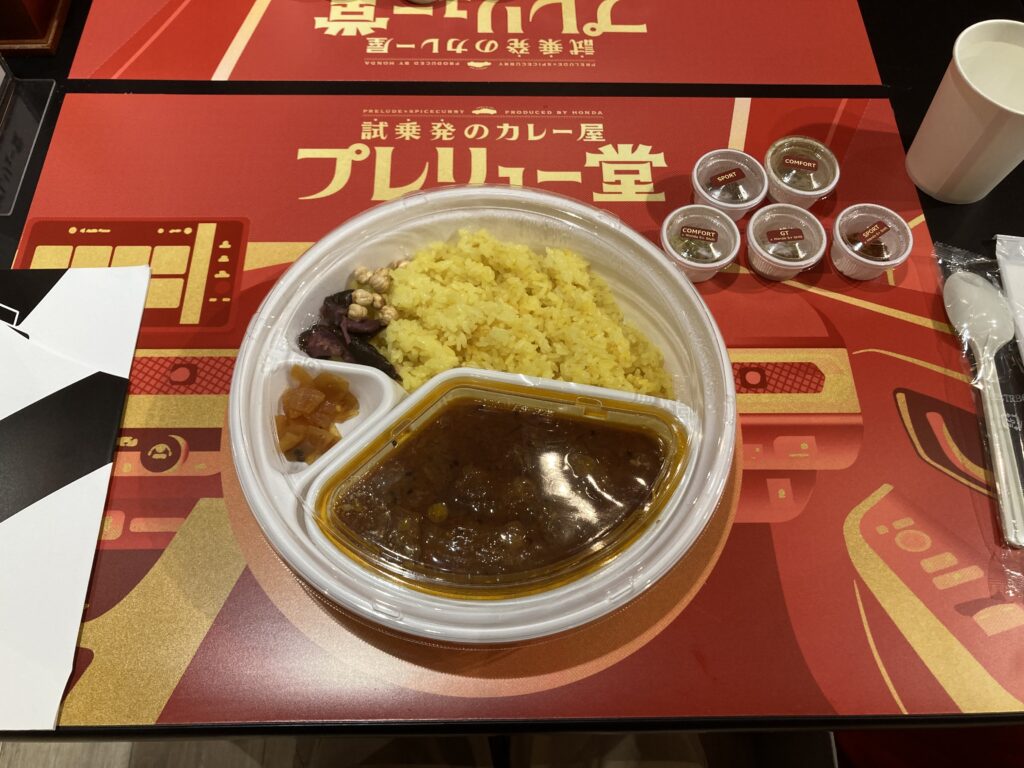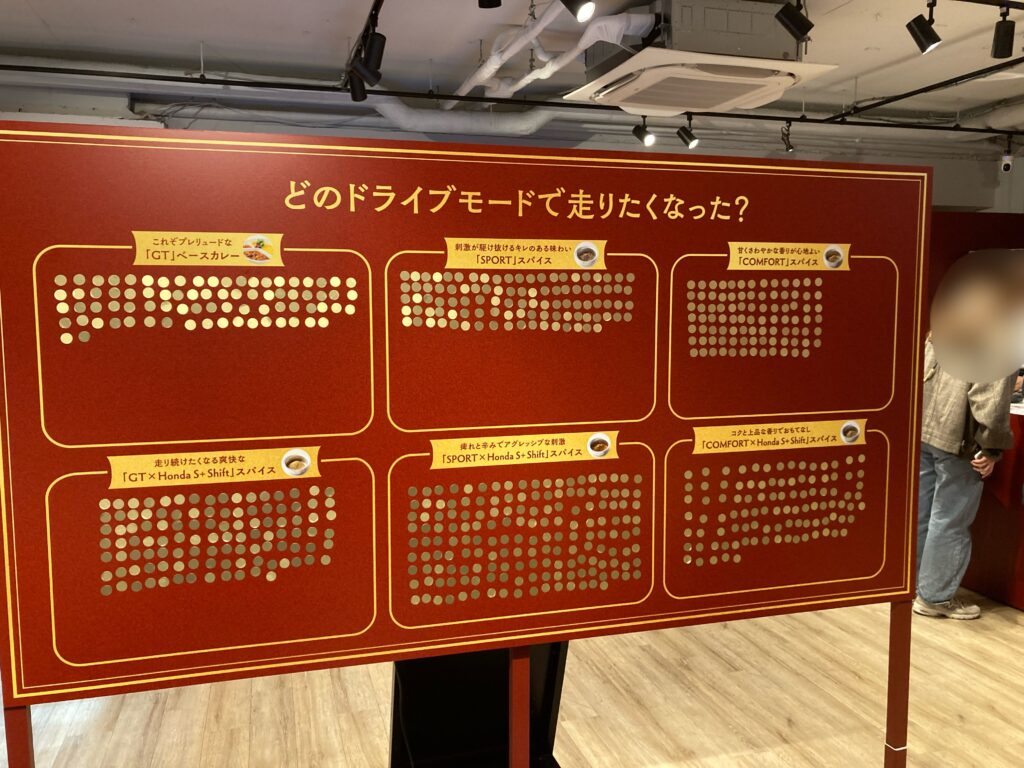 プレリュードを試乗した人なら共感間違いなしな(試乗していない方は思わず試乗したくなる!)実車さながらの「キャラクターの違い」を体感できるスパイスカレー、ユニークでかつ本当に美味しかったです。店内には投票ボードがあり、気に入った走行モード(ベースのカレーもしくはスパイス)に一票入れられる遊び心も。